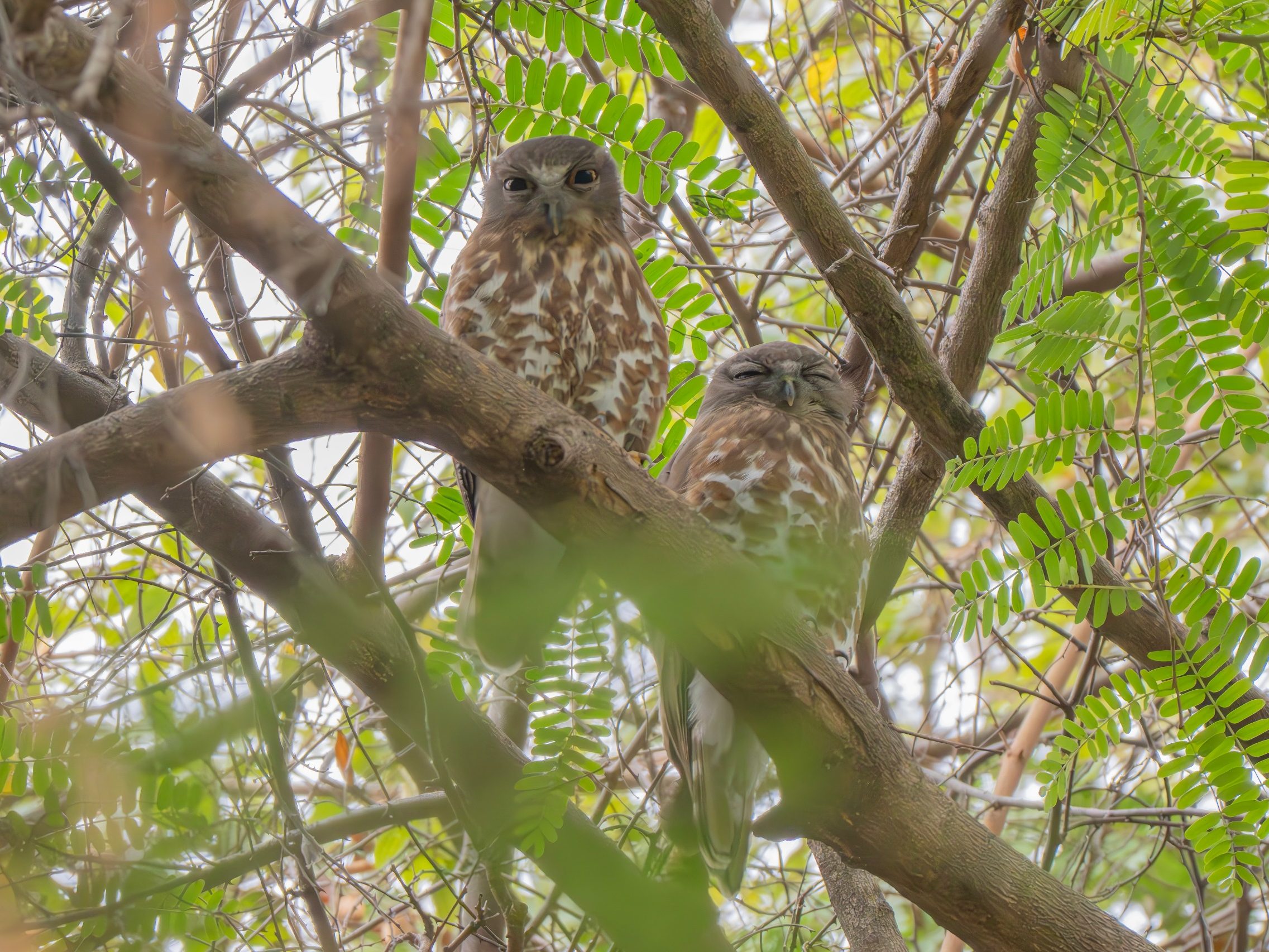 Just when we thought the “mission” was ending, Thomraj signaled us to freeze. High up in the canopy, perched like the supreme judges of the forest, was a pair of Owls.
